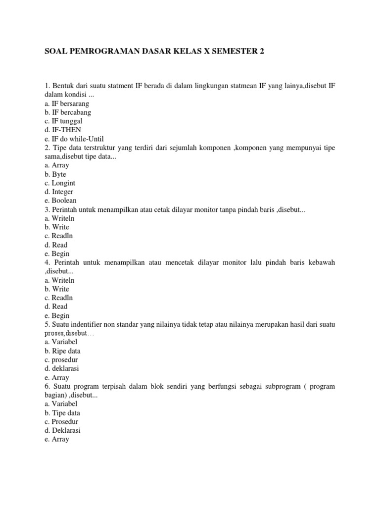 Pemrograman terstruktur adalah suatu proses untuk mengimplementasikan urutan langkah untuk menyelesaikan suatu masalah dalam bentuk program. Pilihlah salah satu jawaban yang benar dengan memberi tanda silang (x) pada huruf a, b, c, d dan e! Conroh soal dan jawaban uts pemrograman dasar kelas x semester 1 dan 2 dalam menyusun suatu programlangkah pertama yang harus di lakkukan adalah sebuah prosedur langkah demi langkah yang pasti untuk menyelesaikan sebuah masalah di sebut. Algoritma dan pemrograman dasar c merupakan salah satu materi kuliah saat saya di bangku kuliah selain itu se pengetahuan saya smk jurusan rpl rekayasa perangkat lunak juga mempelajari pemrograman dasar c ini. Soal soal & jawaban tentang java.